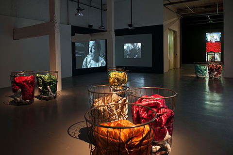 GÜLSÜN KARAMUSTAFA Memory of a Square, 2005 Double Screen Video-Installation, 17 Min. Und Mystic Transport, 1992 20 Drahtkörbe mit Rollen, 20 traditionelle Quilts, Masse variable Courtesy the artist and BüroSarıgedik