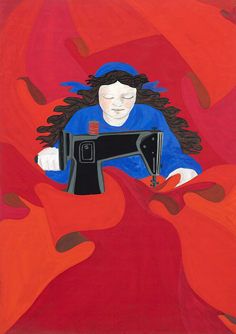 GÜLSÜN KARAMUSTAFA Poster for the 1977 First of May (Woman Constantly Sewing Red Flags with her Sewing Machine), 1977 Mixed media auf Papier, 50 x 70 cm Courtesy the artist and BüroSarıgedik